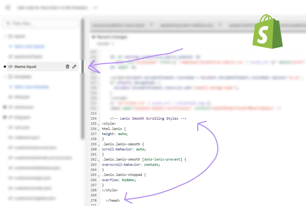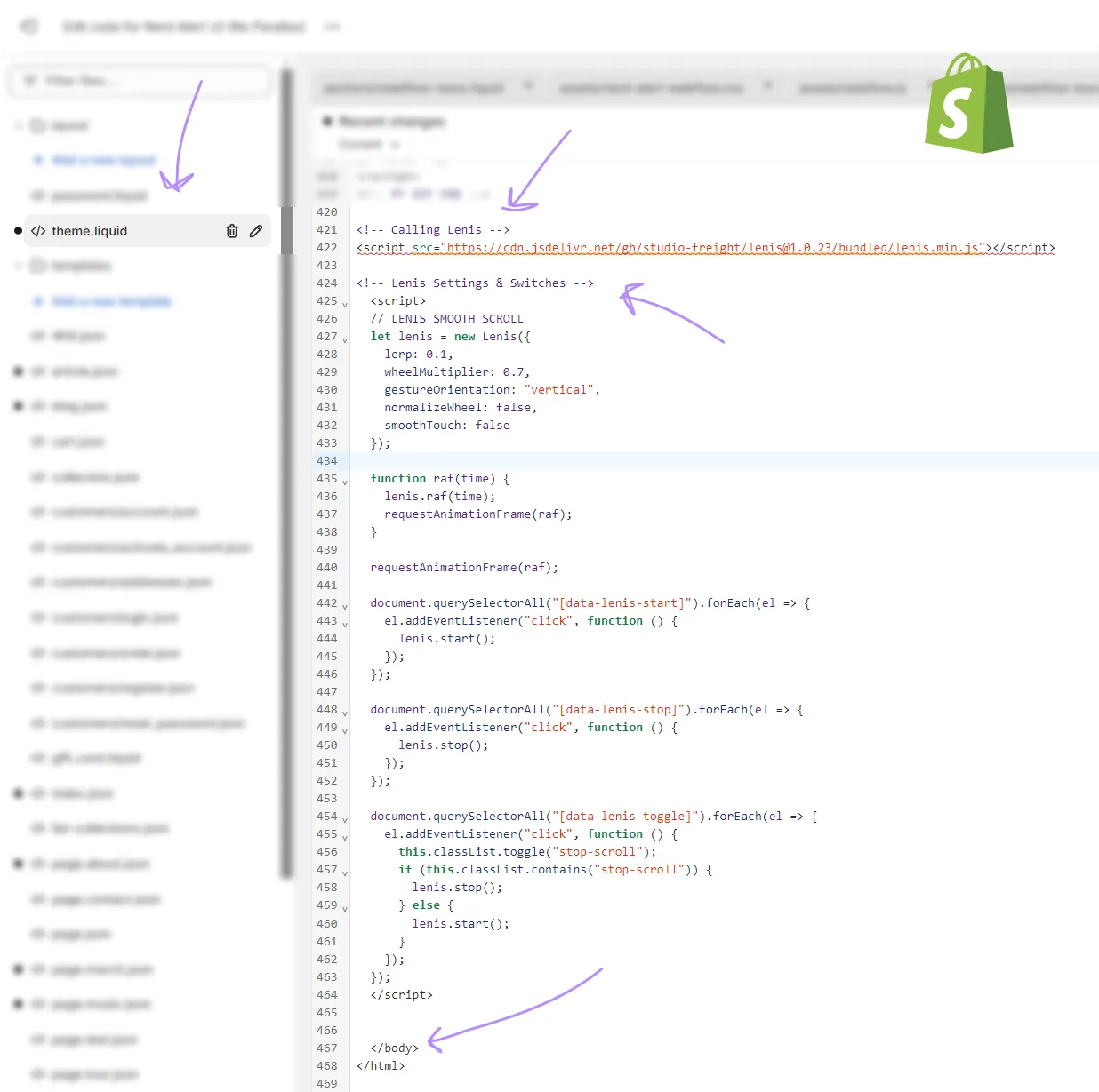 Then, you'll want to add the "Calling Lenis" and "Lenis Settings & Switches" just before the </body> closing tag in your main "theme.liquid" file.